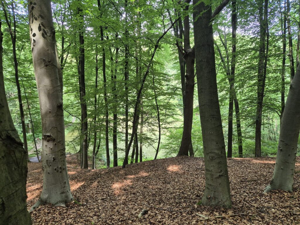 You walk along paved and unpaved roads, field paths, and forest trails.